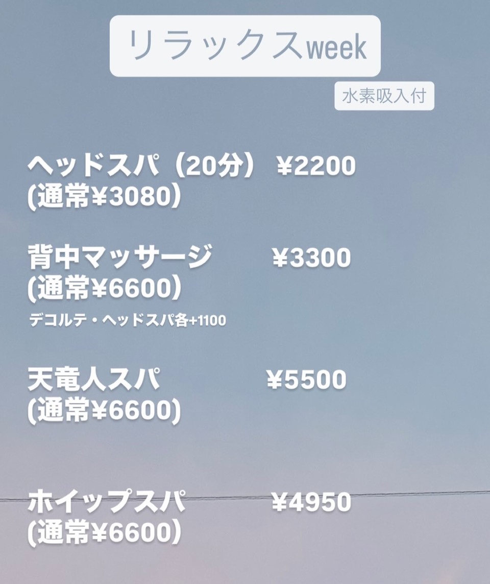 さて明日からはリラックスタイムweekということで一週間限定でルンルンのマッサージメニューを