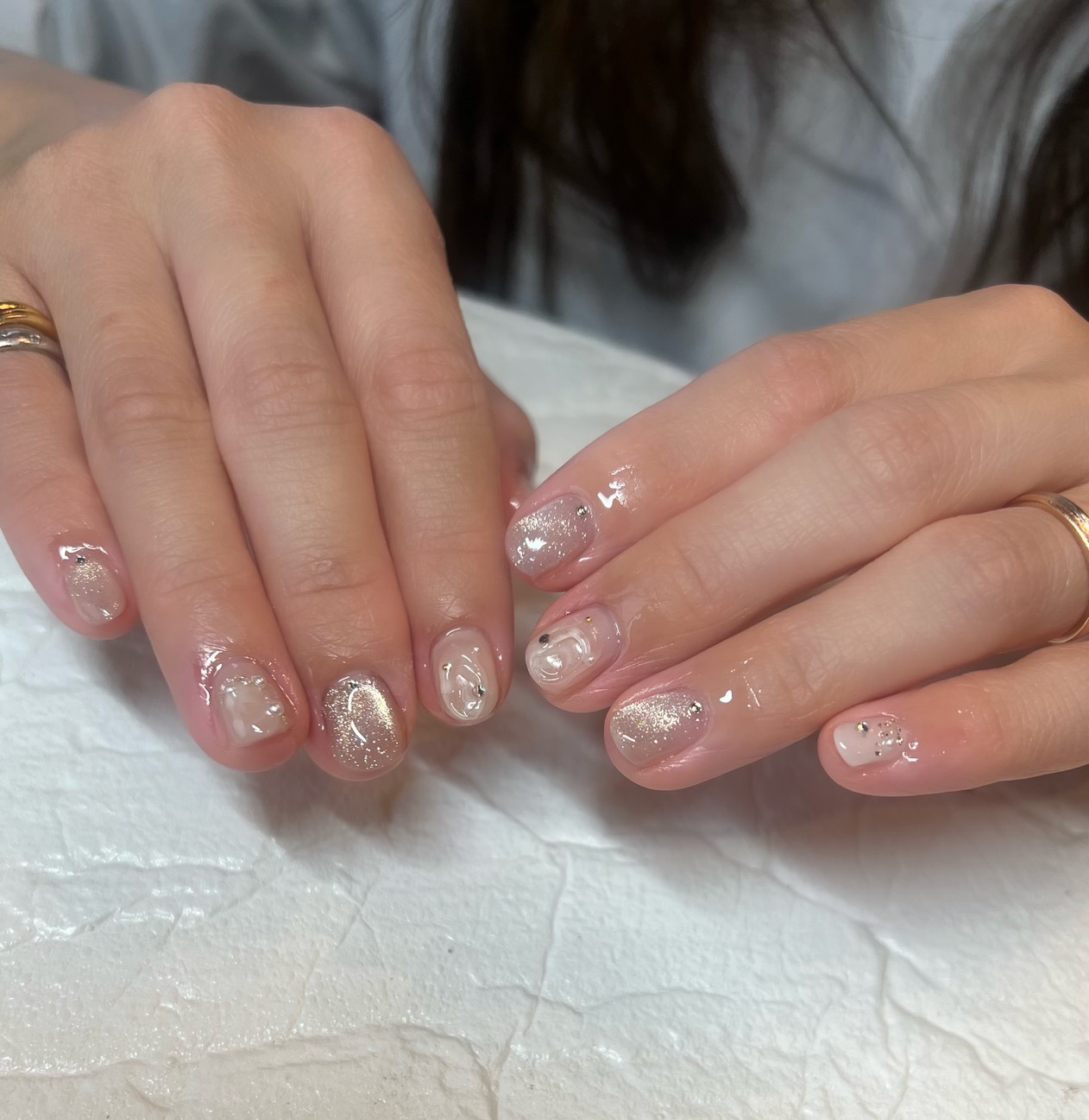 透け感のあるニュアンスカラーをベースにすることで、指先の存在感を強くしすぎず自然に見せます。